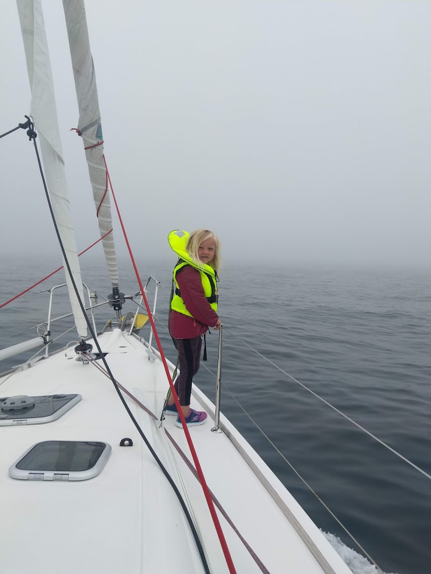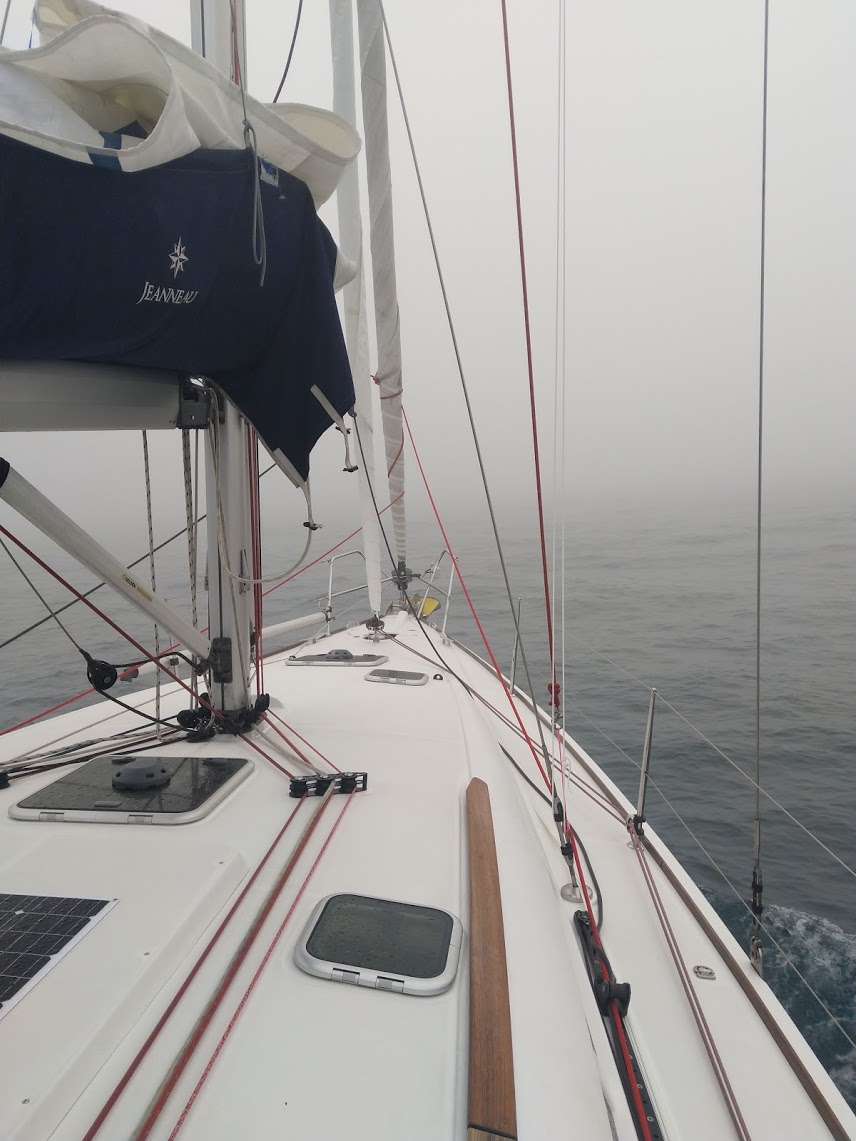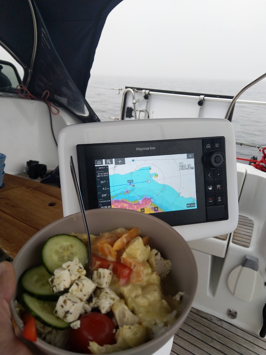 Dag to bød på sør vestlig vind mellom 6 og 8 m/s så vi hadde på en fin slør (vinden inn fra siden) hele dagen og kostet avgårde i 8-9 knop. Da vinden løyet utpå kvelden og vi nærmet oss oljeplattformene på britisk sokkel kom tåka (og siden har den vært her). Vi prøvde å snike oss så nærme som mulig en plattform vi skimtet i det grå, men da var det raskt en hyggelig engelskmann på VHF’en og ba oss om å endre kurs til en trygg avstand 🙂 Sikten var gjennom kvelden og natten så dårlig at vi ikke så snurten av alle de oljeinstallasjonene vi passerte. Det har vært godt å ha en skikkelig radar det siste døgnet!