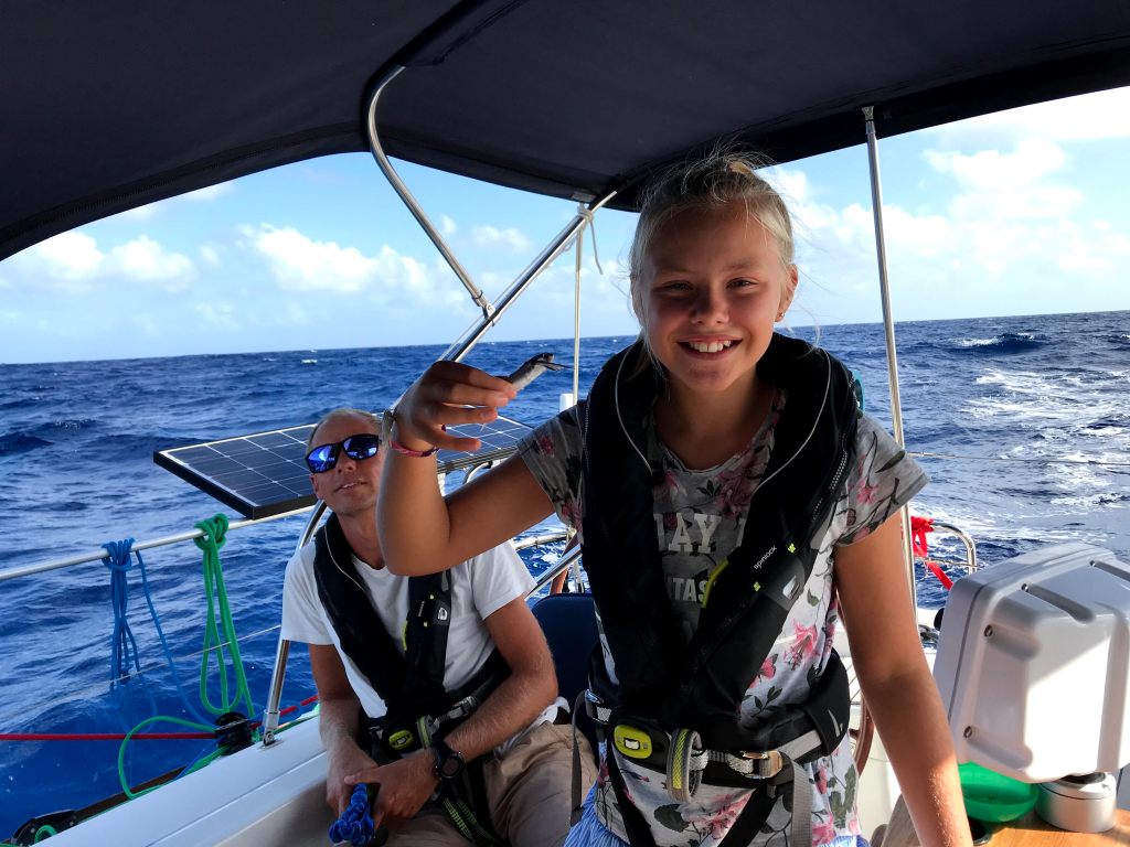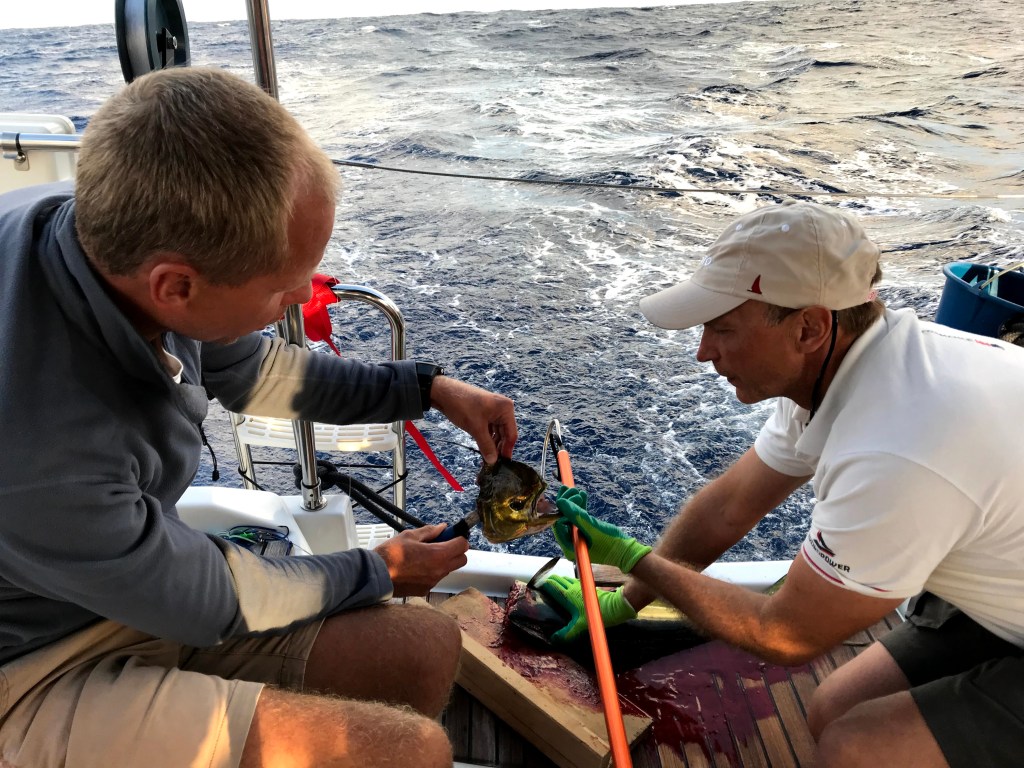For to dager siden satt endelig fisken på kroken igjen og vi kunne hale ombord den første doradoen rett før mørket kom. Denne var heldigvis ikke så stor som den første vi mistet, så vi klarte både å beholde den ombord og spise den opp. I går var det deilig fisk med ris og grønnsaker til middag. Noen liker, andre liker ikke…