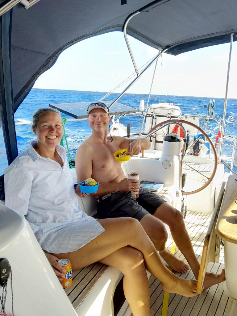 Dagene går fort. Vi har stort sett sol og fint vær, med noen dråper regn av og til. Temperaturen vi vannet stiger jevnt og er nå oppe i 26,7 grader, noe som gjør det varmt i båten. Det er på tide å pakke bort dyner og langbukser på nattevakt.