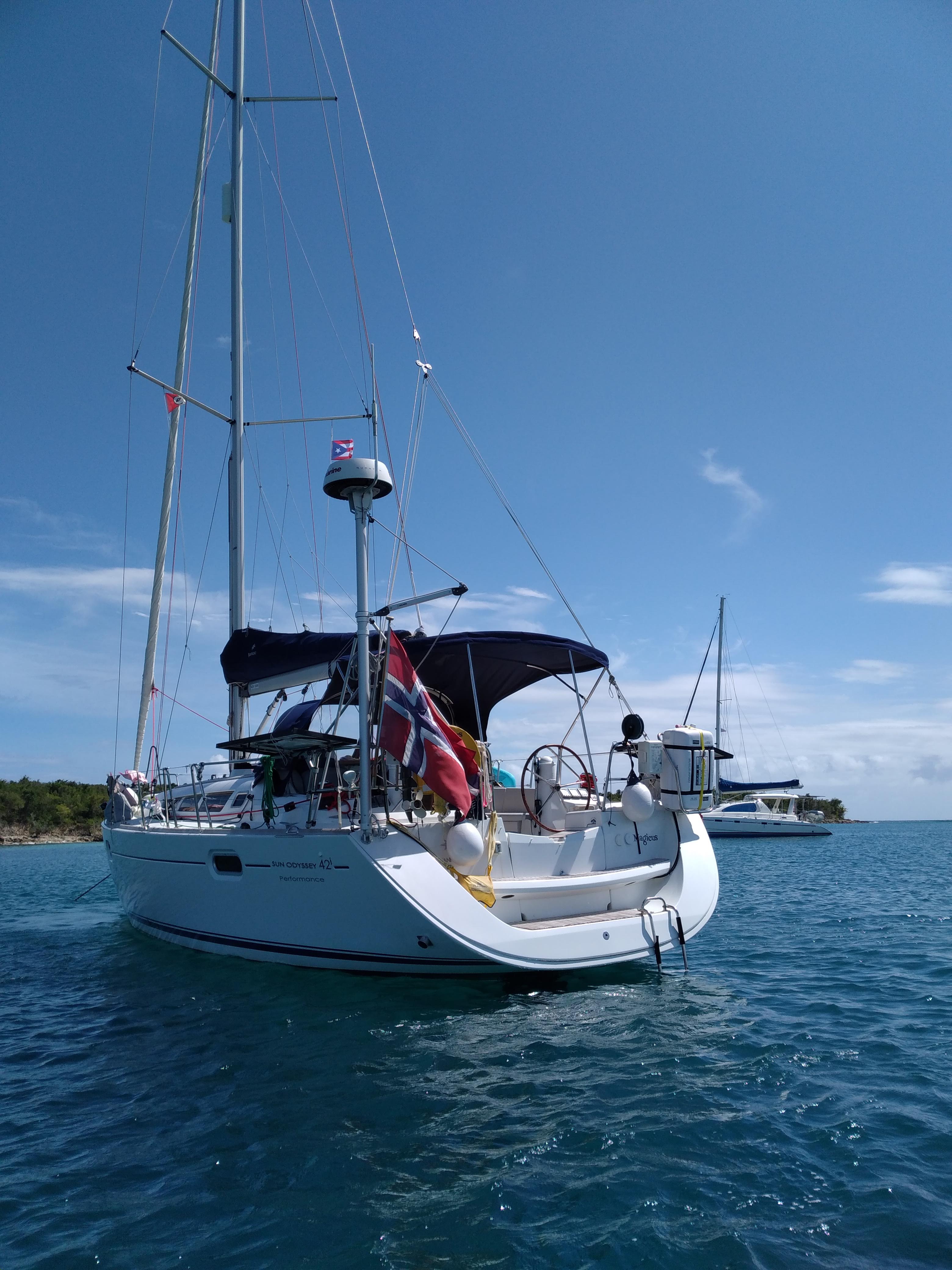 Vi er for tiden på den lille øya Vieques som er en del av Puerto Rico. Det vil si at vi befinner oss i amerikansk farvann. Her er det full lock down på lik linje med hjemme, men vi har funnet oss en fin bukt der vi ligger godt. Politibåten var innom i går kveld og sjekket at alle hadde det bra. Hyggelige karer som gav oss telefonnummeret med beskjed om at det bare var å si fra om vi trengte noen form for hjelp 🙂